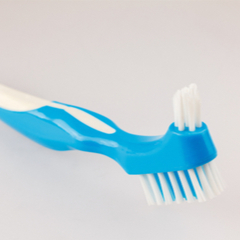 Een kunstgebit is vervaardigd van hard materiaal, maar wees toch voorzichtig om niet te beschadigen. Gebruik een zachte borstel en wrijf niet te hard. Voor plekken en moeilijk te verwijderen aanslag kun je periodiek een product gebruiken met een langere inwerktijd.